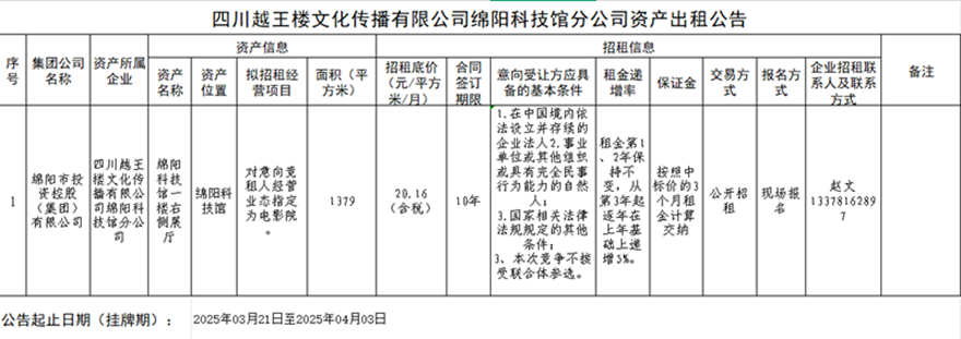 四川越王樓文化傳播有限公司綿陽科技館分公司資產(chǎn)出租公告