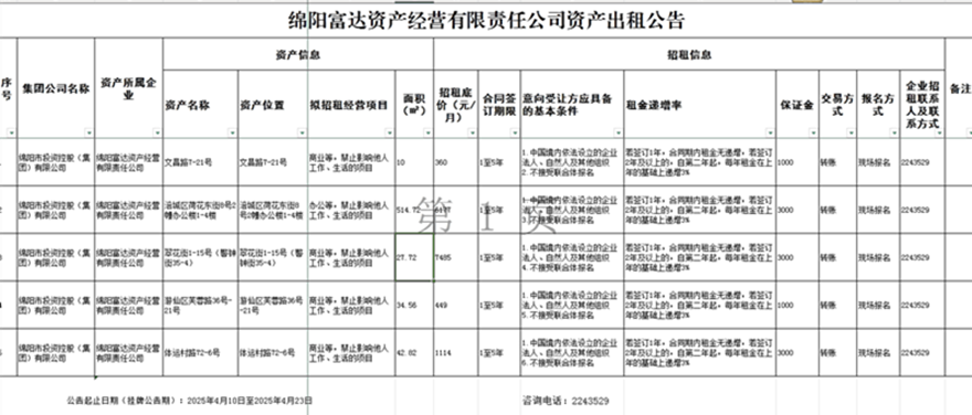 綿陽富達(dá)資產(chǎn)經(jīng)營有限責(zé)任公司資產(chǎn)出租公告
