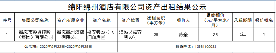 綿陽綿州酒店有限公司資產(chǎn)出租結果公示