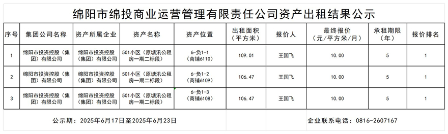 綿陽市綿投商業(yè)運營管理有限責任公司資產(chǎn)出租結(jié)果公示