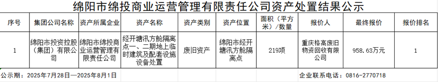 綿陽市綿投商業(yè)運(yùn)營管理有限責(zé)任公司資產(chǎn)處置結(jié)果公示