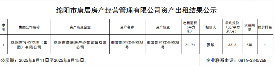 綿陽(yáng)市康居房產(chǎn)經(jīng)營(yíng)管理有限公司資產(chǎn)出租結(jié)果公示