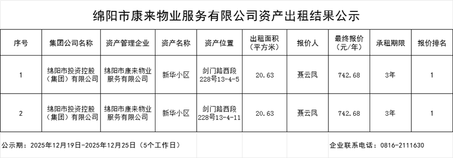綿陽市康來物業(yè)服務有限公司資產(chǎn)出租結(jié)果公示
