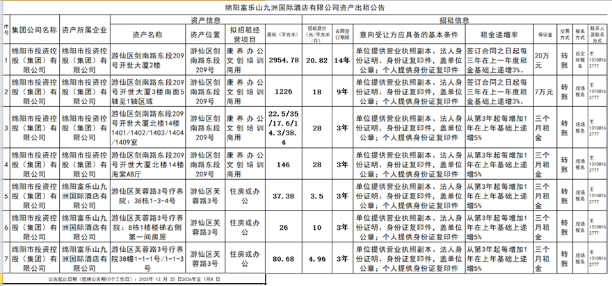 綿陽富樂山九洲國際酒店有限公司資產(chǎn)出租公告
