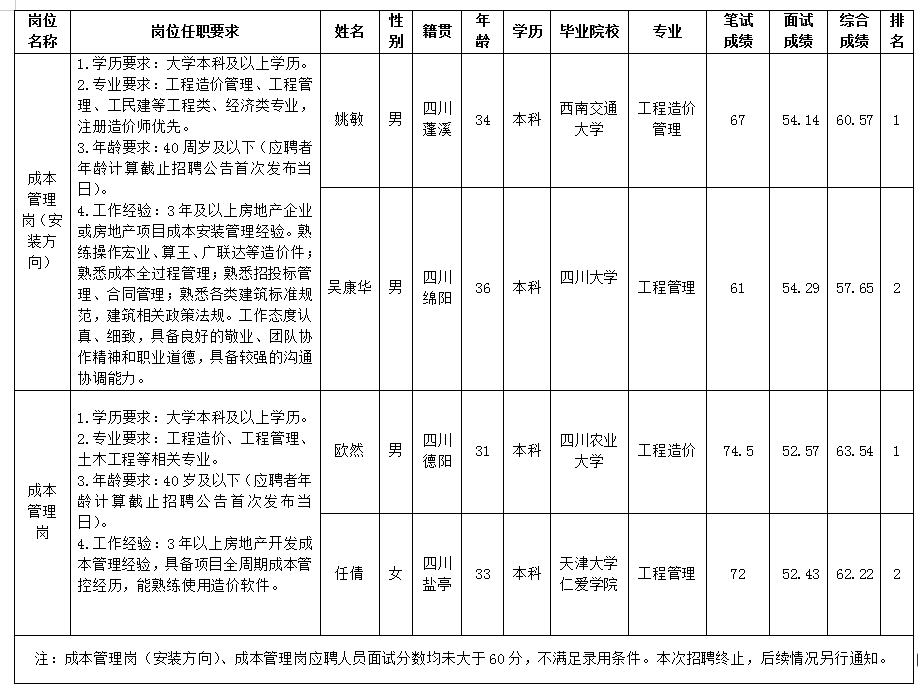 根據(jù)綿陽市綿投置地有限公司發(fā)布的招聘公告及招聘相關規(guī)定,經(jīng)筆試、面試等程序,現(xiàn)將筆試、面試成績予以公示。