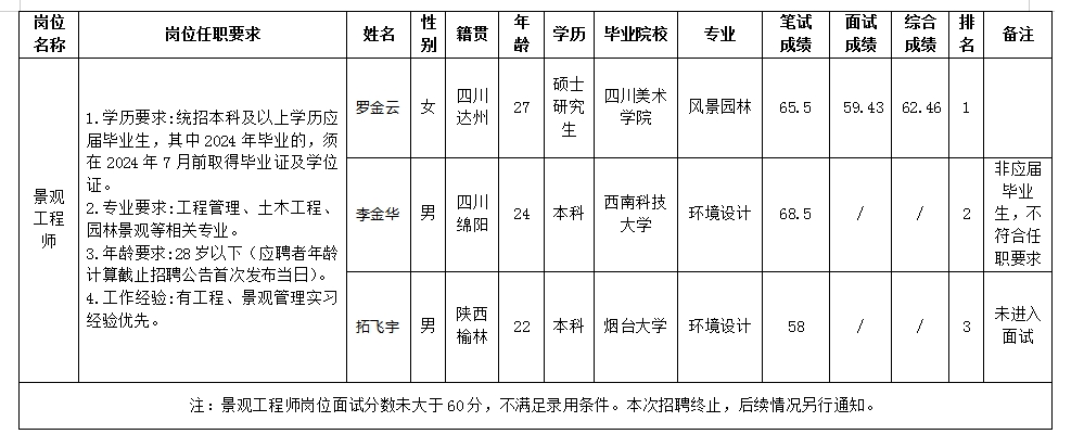 根據(jù)綿陽市綿投置地有限公司發(fā)布的招聘公告及招聘相關(guān)規(guī)定,經(jīng)筆試、面試等程序,現(xiàn)將筆試、面試成績予以公示。