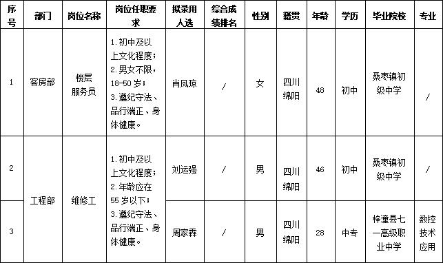 根據(jù)綿陽(yáng)市綿州嘉來(lái)會(huì)務(wù)服務(wù)有限公司發(fā)布的招聘公告及招聘相關(guān)規(guī)定,經(jīng)面試、體檢等程序,擬錄用肖鳳瓊、劉運(yùn)強(qiáng)、周家霖同志到客房部、工程部工作,現(xiàn)予以公示,具體情況如下: