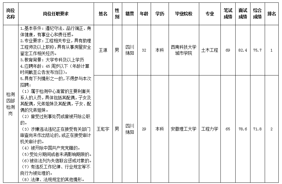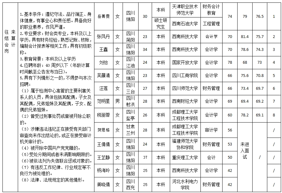 根據(jù)綿陽市建設(shè)工程質(zhì)量檢測中心有限責任公司發(fā)布的招聘公告及招聘相關(guān)規(guī)定,現(xiàn)將筆試、面試成績予以公示。