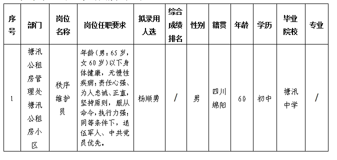 根據(jù)康居公司發(fā)布的長(zhǎng)期招聘一線勤雜人員的招聘公告相關(guān)規(guī)定,經(jīng)面試、體檢等程序,擬錄用楊順勇同志到綿陽(yáng)市康居房產(chǎn)經(jīng)營(yíng)管理有限公司塘汛公租房管理處塘汛公租房小區(qū)工作,現(xiàn)予以公示,具體情況如下: