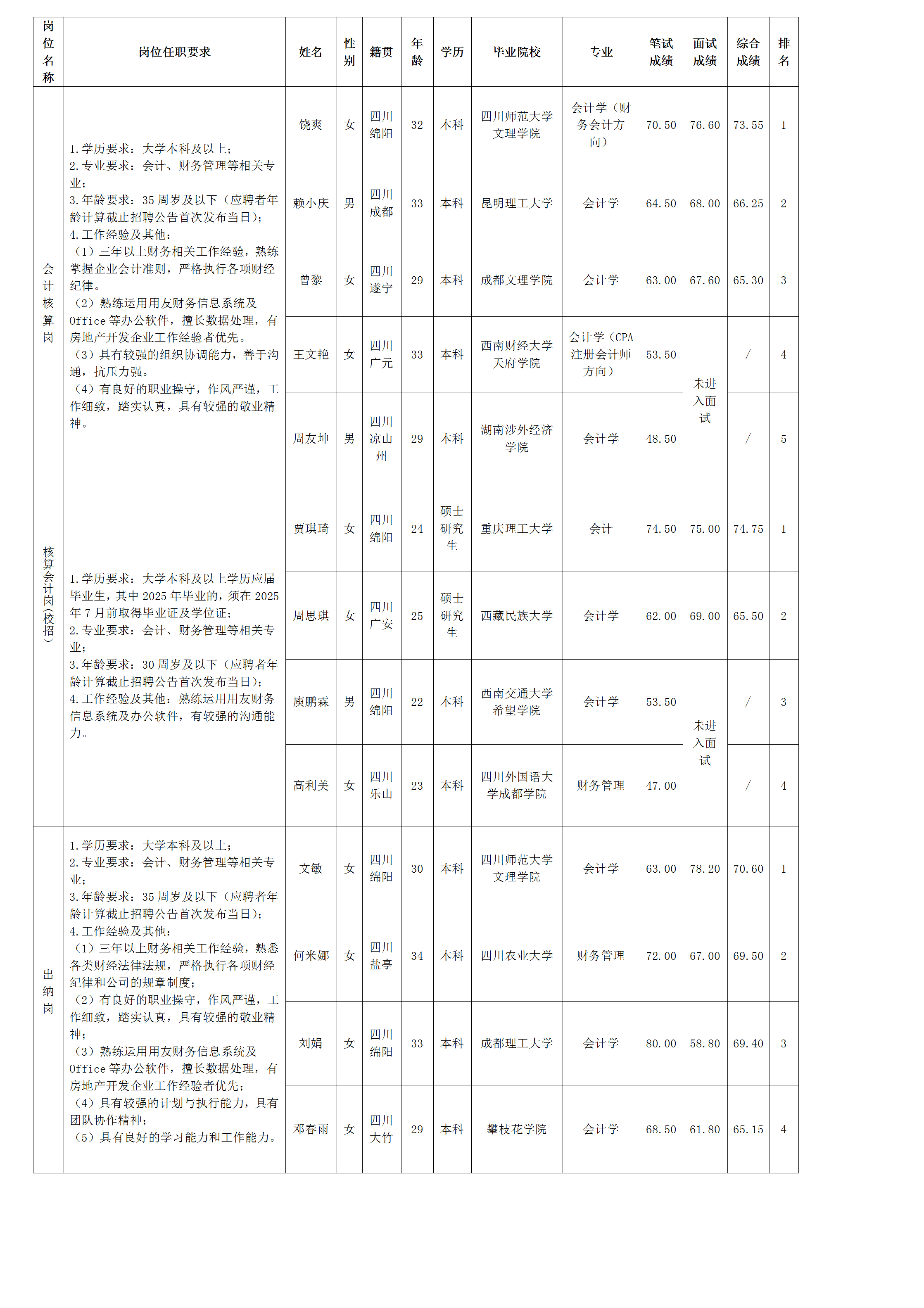 【公開(kāi)招聘】綿陽(yáng)市綿投置地有限公司關(guān)于會(huì)計(jì)核算崗等崗位測(cè)試成績(jī)的公示
