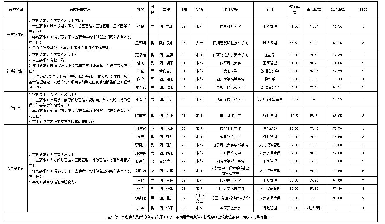 根據(jù)綿陽(yáng)市綿投置地有限公司發(fā)布的招聘公告及招聘相關(guān)規(guī)定,經(jīng)筆試、面試等程序,現(xiàn)將筆試、面試成績(jī)予以公示。