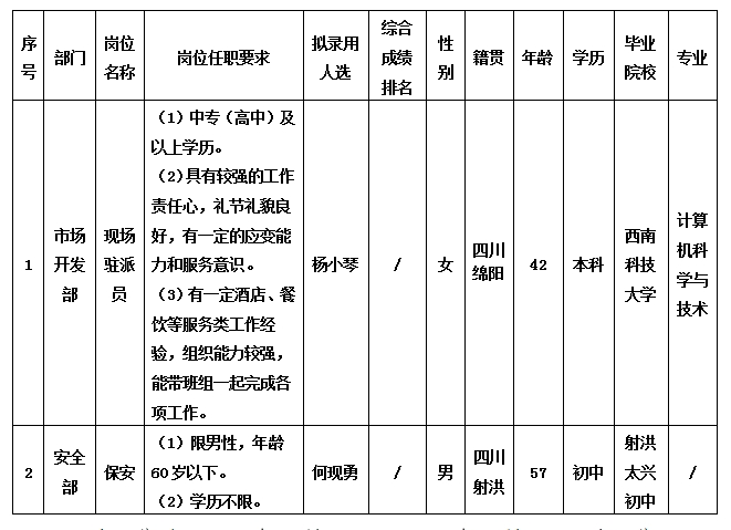 根據(jù)綿陽綿州酒店有限公司發(fā)布的招聘公告及招聘相關(guān)規(guī)定,經(jīng)面試、體檢等程序,擬錄用楊小琴等同志到我司工作,現(xiàn)予以公示,具體情況如下: