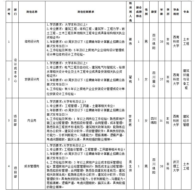【公開(kāi)招聘】綿陽(yáng)市綿投置地有限公司關(guān)于結(jié)構(gòu)設(shè)計(jì)崗等崗位擬錄用人選的公示