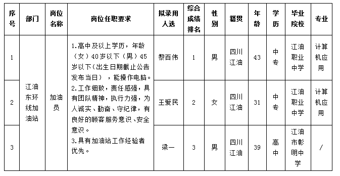 【公開(kāi)招聘】四川綿江能源有限公司 關(guān)于招聘加油員崗位擬錄用人員的公示