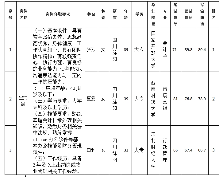 【內(nèi)部選聘】綿陽市康來物業(yè)服務(wù)有限公司關(guān)于財(cái)務(wù)部出納崗內(nèi)部選聘測試成績的公示