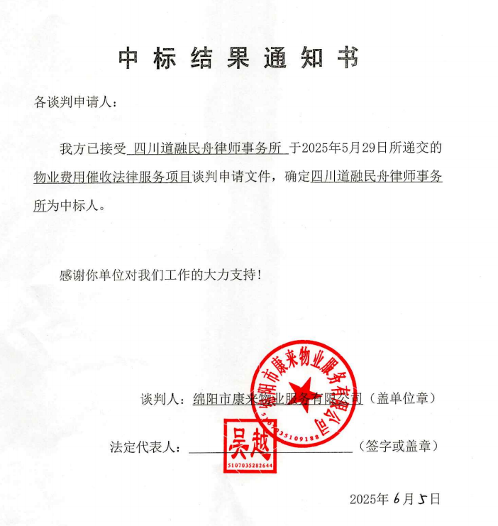 物業(yè)費(fèi)用催收法律服務(wù)項(xiàng)目中標(biāo)結(jié)果通知書