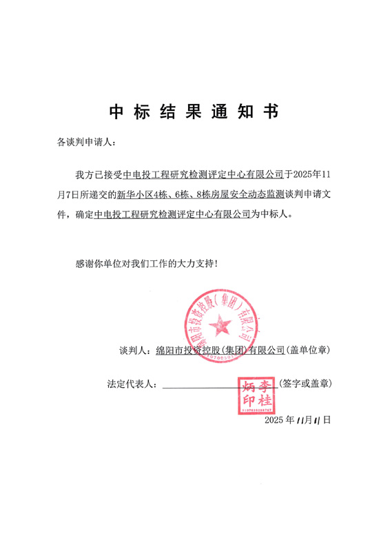 新華小區(qū)4棟、6棟、8棟房屋安全動(dòng)態(tài)監(jiān)測中標(biāo)結(jié)果通知